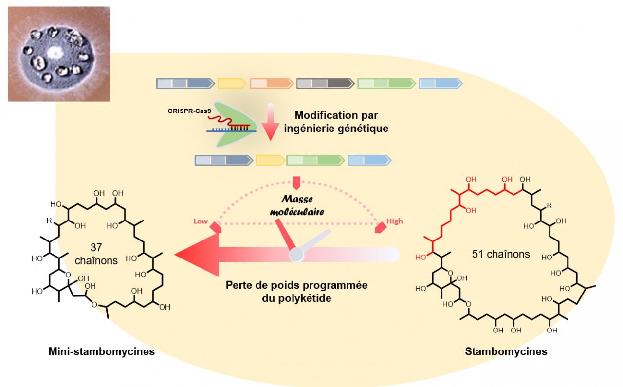 En utilisant diverses stratégies de pointe, les travaux réalisés ont permis de retirer, directement chez la bactérie S. ambofaciens, 7 modules entiers sur les 25 que compte de la chaîne d’assemblage des stambomycines, et ainsi d’obtenir une souche mutante produisant une série de mini-stambomycines « allégées » à 37 chaînons. Ils ont également permis d’identifier plusieurs facteurs influençant l’efficacité de cette ingénierie, ce qui permettra à terme d’améliorer les rendements de production de ces polykétides à structure simplifiée. Il reste maintenant à caractériser les propriétés biologiques de ces nouvelles formes simplifiées de stambomycines.