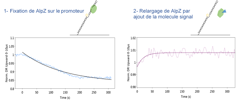 Une équipe de l’UMR UL-INRAE 1128 DynAMic s’intéresse à la régulation de la biosynthèse de kinamycines chez la bactérie Streptomyces ambofaciens. Parmi les différents facteurs de transcription impliqués dans cette régulation, la protéine AlpZ est un acteur majeur qui contrôle négativement la cascade de régulation de la production de kinamycines. Son action est modulée par une molécule de signalisation de nature encore inconnue. La fixation de AlpZ sur la séquence promotrice de ses gènes cibles et son relargage en présence de la molécule signal ont été caractérisés en temps réel en utilisant pour la première fois la technologie switchSENSE® disponible sur la plateforme ASIA. Les résultats viennent de faire l’objet d’une publication dans la revue Frontiers in Microbiology [Vicente C.M., Girardet J.M., Hôtel L. & Aigle B. (2020). Molecular dynamics to elucidate the DNA-binding activity of AlpZ, a member of the gamma-butyrolactone receptor family in S. ambofaciens. Front. Microbiol, 11.:1255. doi: 10.3389/fmicb.2020.01255].